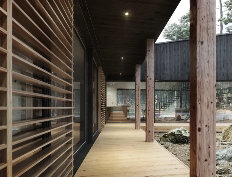 Op het eerste gezicht lijkt Blackhouse geïnspireerd door een kindertekening: een eenvoudige vorm, een steil zadeldak, recht in het landschap. Maar de schijnbare eenvoud is doordacht. De prefab houten skeletbouwwoning is bekleed met shou sugi ban – verkoold hout dat robuust verweert en oplost in de Noord-Hollandse omgeving. Binnen bepaalt een open plattegrond met vide de sfeer: licht van alle kanten, zichtlijnen die de tuin binnentrekken. Privéruimtes bevinden zich op de verdieping. Het bijgebouw functioneert als atelier of praktijkruimte. JEB architecten ontwierp Blackhouse als een duurzame vrijstaande woning voor een gezin – gebouwd voor de lange termijn.
